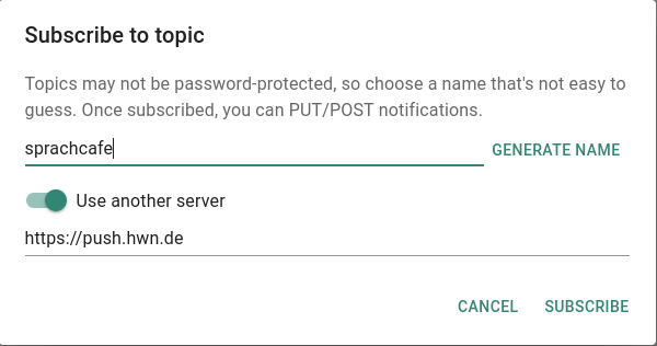 Der Kanal läßt sich auch über die Herstellerseite ntfy.sh abonnieren. Auch hier wählt man Thema abonnieren. Bevor man das Thema "sprachcafe" eingibt, muss man als Server "pad.hwn.de" einstellen.